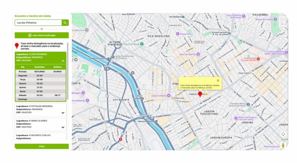 Você pode verificar os horários da coleta em Pinheiros pelo site da Loga ou do Recicla Sampa. Em ambos, basta digitar o nome da sua rua, confirmar o CEP e visualizar os dias e horários da coleta domiciliar ou seletiva. Caso o sistema marque um ponto incorreto no mapa, é possível ajustar manualmente movendo o marcador para o endereço correto.