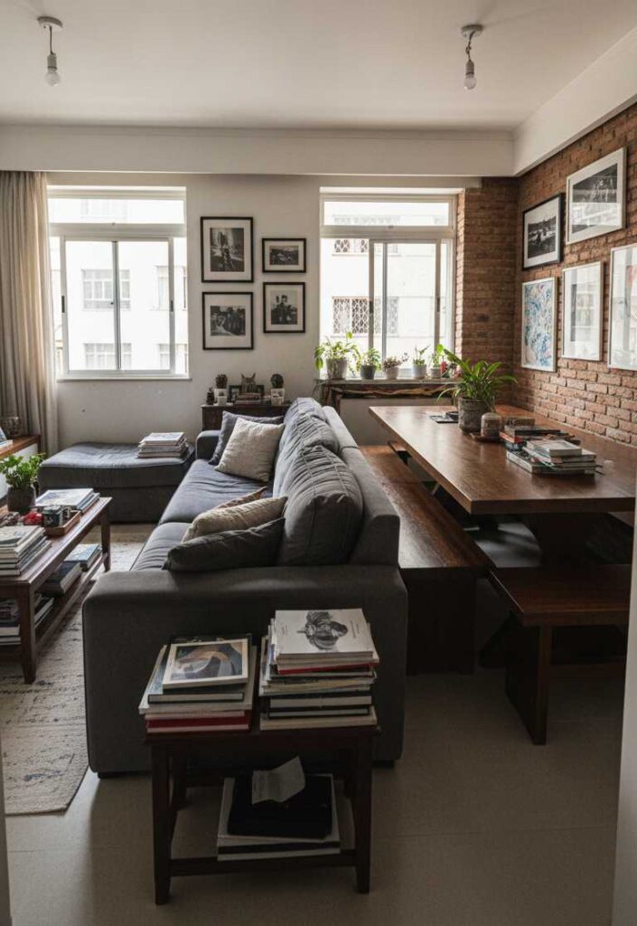 Um dos erros mais comuns em apartamentos pequenos é tentar reproduzir soluções pensadas para imóveis maiores. Sofás profundos, mesas largas e armários volumosos ocupam espaço excessivo e comprometem a circulação.